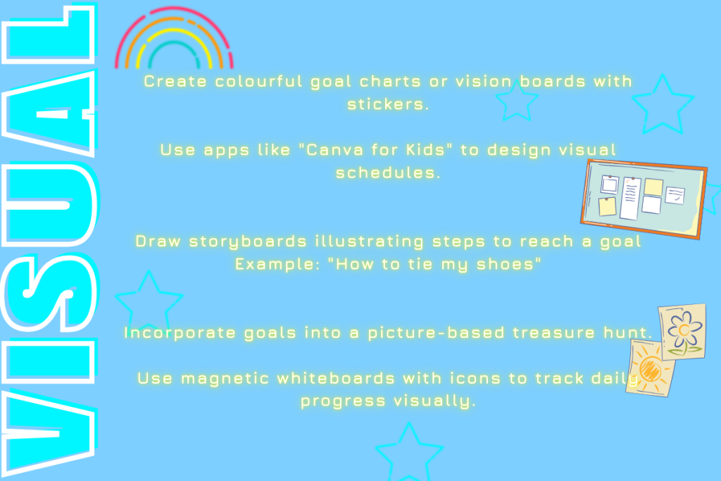 - Visual Learners: Use colour-coded charts, illustrated task checklists, progress tracking boards with stickers, video-based instructions, drawing tasks related to goals